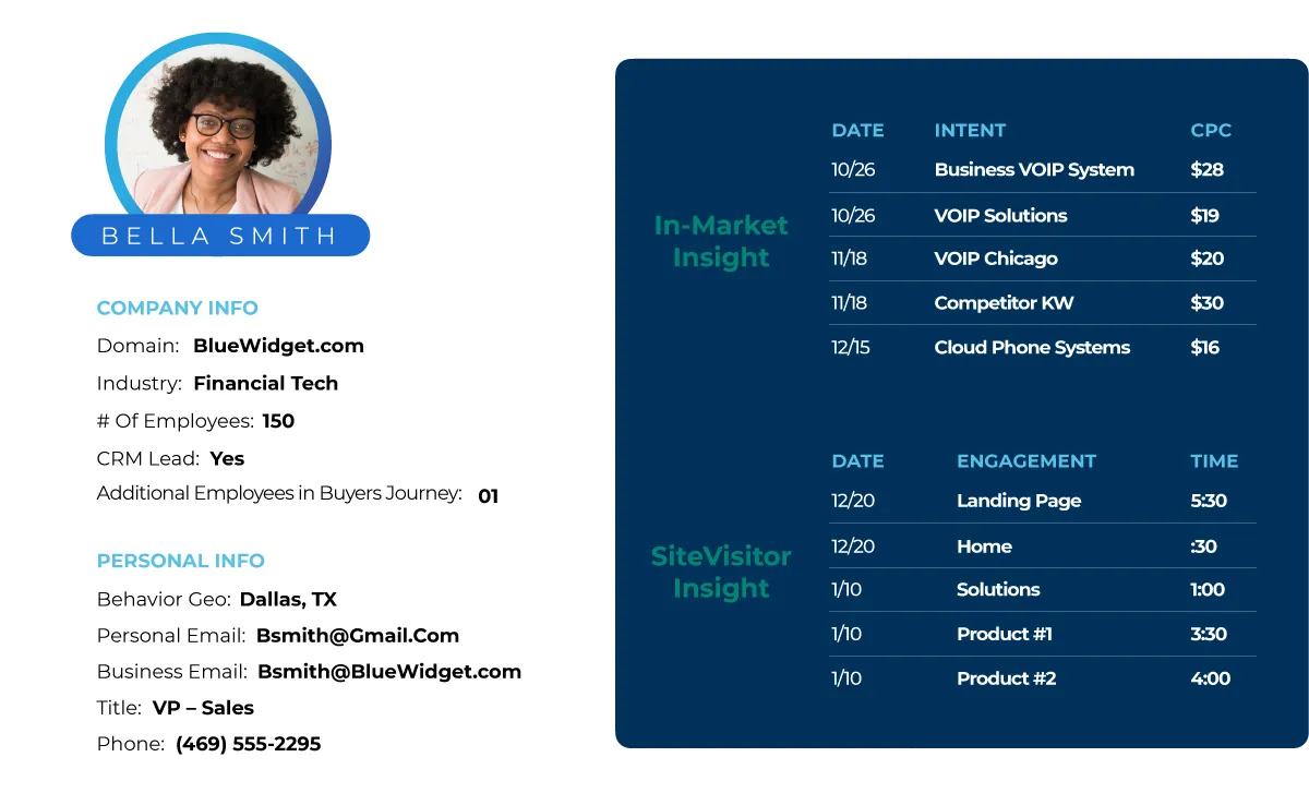 Wish you knew who was searching the web for the exact type of products or services you offer? Our database of 40 Billion + realtime behaviors per day allows us to deliver those buyer leads to you, so you can start a sales conversation, or a laser targeted marketing campaign.